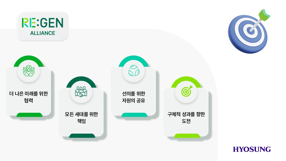 효성은 더 나은 미래를 위한 동행을 준비하며, RE:GEN ALLIANCE로 함께 나아가고자 합니다. 이 동맹은 오늘을 사는 세대뿐 아니라 미래를 살아갈 세대를 위한 응답이기도 합니다. 혼자서는 그릴 수 없는 미래를, 함께 힘을 합치면 더 구체적인 미래로 바꿀 수 있습니다. 하나의 기업으로는 이루지 못할 지구의 미래를, 효성은 함께 고민하고 행동하며 보다 안전하고 지속 가능한 세상으로 바꿀 수 있다고 믿습니다. 그래서 효성은 이 동행에 첫 발을 내딛습니다.